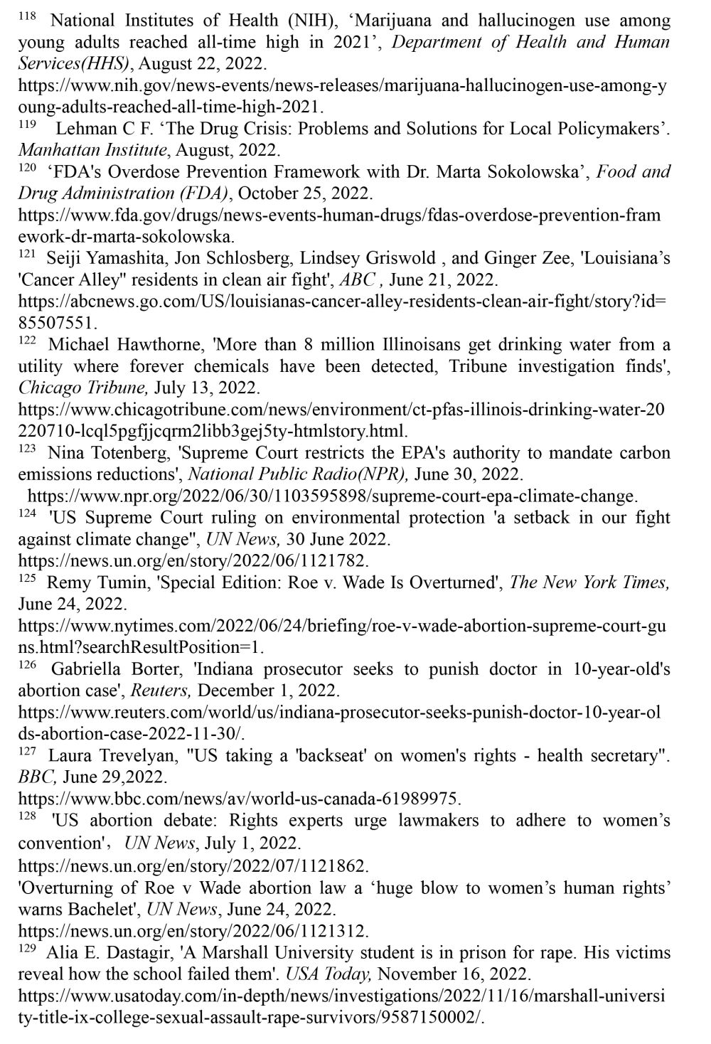禁止堕胎侵犯妇女权利。2022年,美国联邦最高法院推翻了保障妇女堕胎权的“罗伊诉韦德案”和“计划生育联盟诉凯西案”,终结了近50年来受宪法保护的堕胎权,将导致大约一半的州禁止堕胎手术。(注125)路透社2022年12月1日报道,印第安纳州总检察长要求该州医疗委员会对一名医生进行纪律处分,因为该医生为一名10岁的强奸受害者进行了堕胎手术,而俄亥俄州已经禁止在妊娠六周后堕胎。(注126)英国广播公司2022年6月29日报道,美国卫生部长泽维尔·贝塞拉表示,世界其他地区正在采取行动,给予女性应该拥有的各种权利,而美国联邦最高法院却倒行逆施,剥夺宪法确认的堕胎权,这使美国落后于世界其他地区。(注127)时任联合国人权事务高级专员的米歇尔·巴切莱特2022年6月24日指出,美国联邦最高法院关于堕胎的裁决是“对妇女人权和性别平等的巨大打击”,“这一裁决标志着美国通过‘罗伊诉韦德案’保护性健康和生殖健康及权利的努力在50年后遭受重大挫折”。(注128)