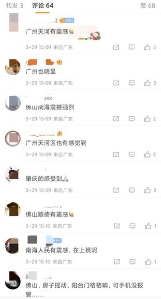 随即,“佛山地震”“广州震感”等相关话题在社交平台引起讨论,佛山禅城区、南海区,东莞、广州等地网友表示,震感明显。