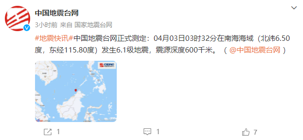 南海海域发生6.1级地震,震源深度600千米 2023-04-03 07:50 中国地震台网微博 1 中国地震台网正式测定:04月03日03时32分在南海海域(北纬6.50度,东经115.80度)发生6.1级地震,震源深度600千米。 编辑:黄炜明 审核:练海林