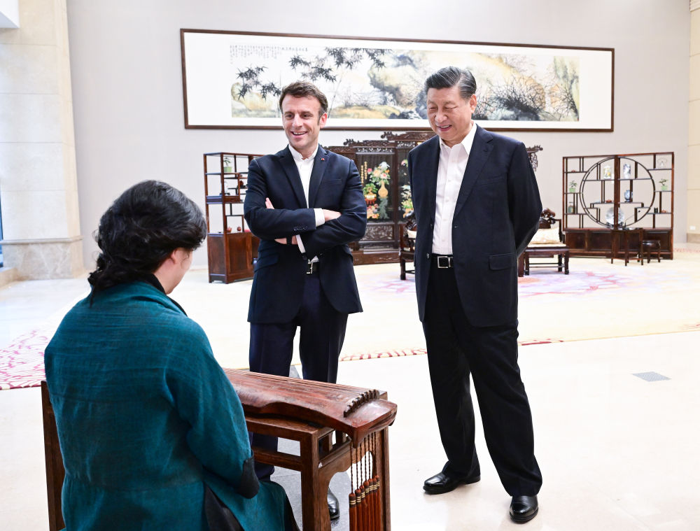 4月7日下午,国家主席习近平在广东省广州市松园同法国总统马克龙举行非正式会晤。这是两国元首在白云厅欣赏古琴演奏。新华社记者 岳月伟 摄