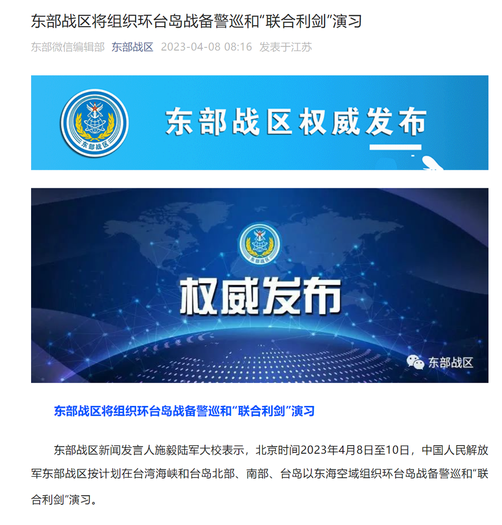 东部战区将组织环台岛战备警巡和“联合利剑”演习 2023-04-08 08:36 东部战区微信公众号、东部战区官方微博 0 东部战区新闻发言人施毅陆军大校表示,北京时间2023年4月8日至10日,中国人民解放军东部战区按计划在台湾海峡和台岛北部、南部、台岛以东海空域组织环台岛战备警巡和“联合利剑”演习。 编辑:杨乔颖