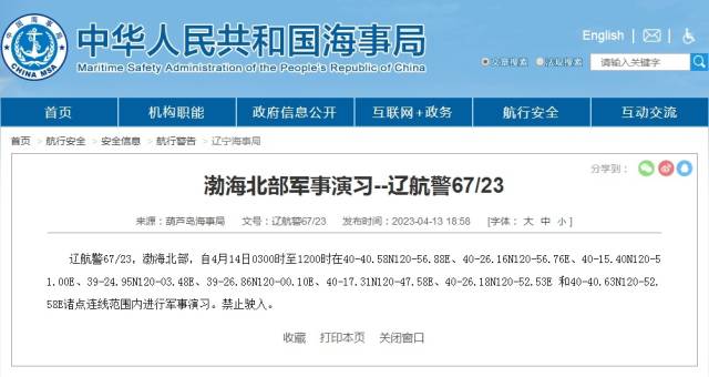 禁止驶入!渤海北部部分海域进行军事演习 2023-04-14 09:01 南方+,中国海事局网站 1 据中国海事局网站消息,葫芦岛海事局发布航行警告,4月14日3时至12时,渤海北部部分范围内进行军事演习,禁止驶入。 编辑:张晓珊 钟淳琳(实习) 审核:蔡颜颜