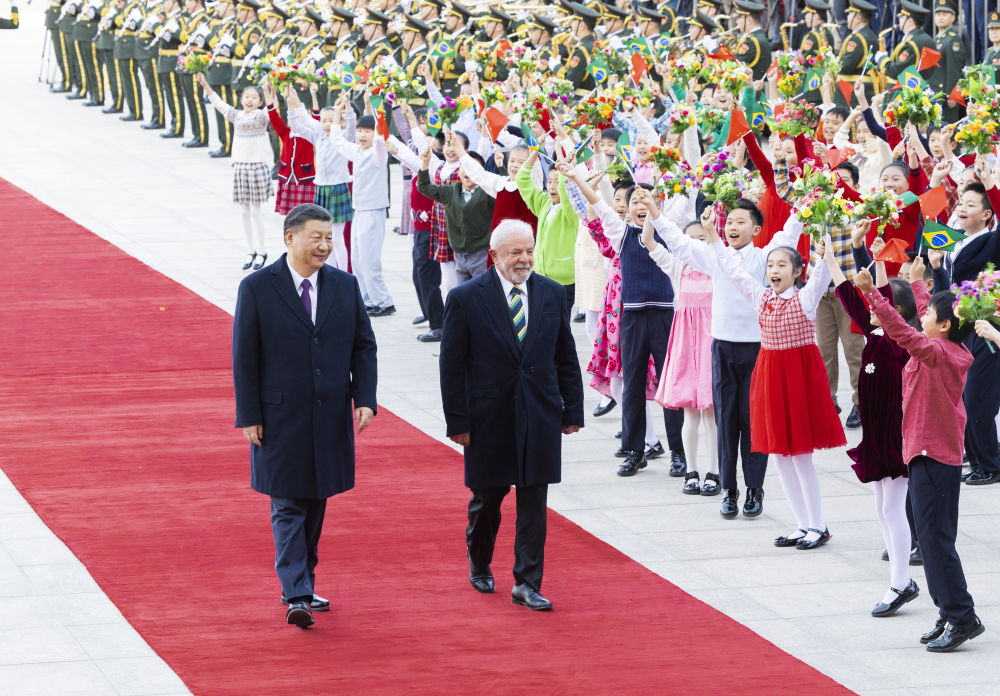 4月14日下午,国家主席习近平在北京人民大会堂同来华进行国事访问的巴西总统卢拉举行会谈。这是会谈前,习近平在人民大会堂东门外广场为卢拉举行欢迎仪式。新华社记者 刘卫兵 摄