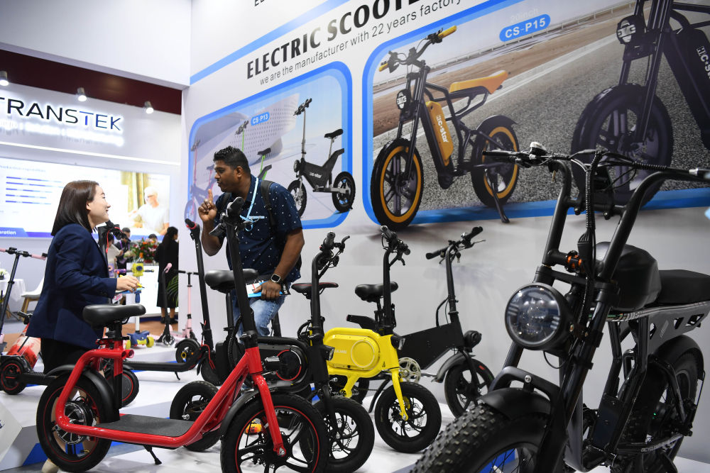 4月15日,采购商(右)和电动自行车参展商在广交会上交流。新华社记者 邓华 摄