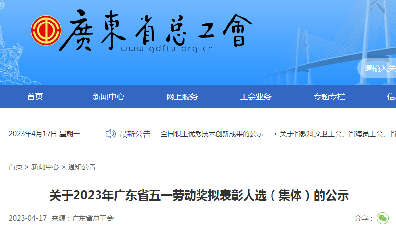 关于2023年广东省五一劳动奖拟表彰人选(集体)的公示
