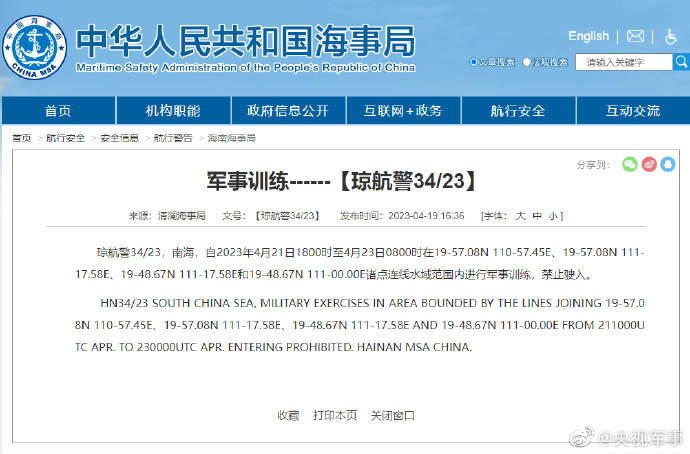 航行警告!南海部分海域军事训练,禁止驶入 2023-04-20 10:52 中国海事局网站 1 据中国海事局网站消息,清澜海事局发布航行警告,自4月21日18时至4月23日8时,南海部分海域进行军事训练,禁止驶入。 编辑:李舒宇 黄思容(实习) 审核:严海苑