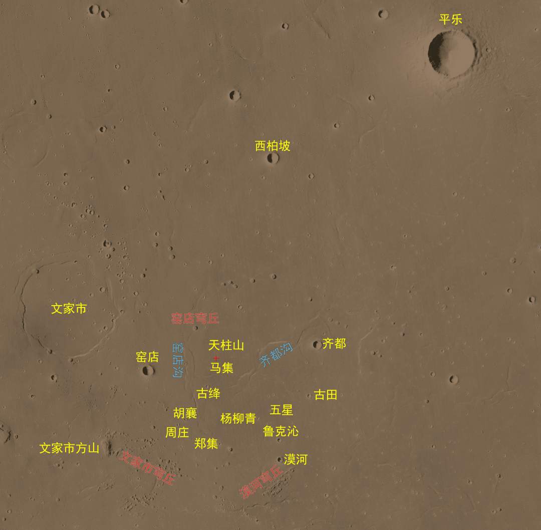 科学研究团队通过火星高分影像,识别了着陆点附近大量的地理实体,国际天文联合会根据相关规则,将其中的22个地理实体,以中国人口数小于10万的历史文化名村名镇加以命名。将中国标识永久刻印在火星大地。
