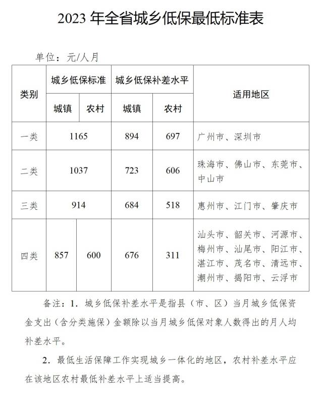全省分四类地区制订城乡低保最低标准,其中广州、深圳等一类地区城乡低保最低标准为1165元/人月,珠海、佛山、东莞、中山等二类地区为1037元/人月,惠州、江门、肇庆等三类地区为914元/人月,汕头、韶关、河源、梅州等四类地区城镇为857元/人月、农村为600元/人月。