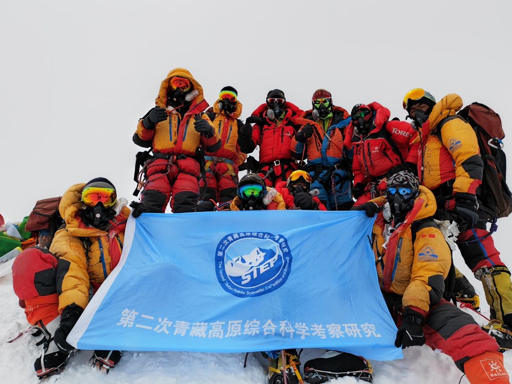 5月23日,科考登顶队员在珠峰峰顶展示第二次青藏高原综合科学考察研究旗帜。(摄影:拉巴)