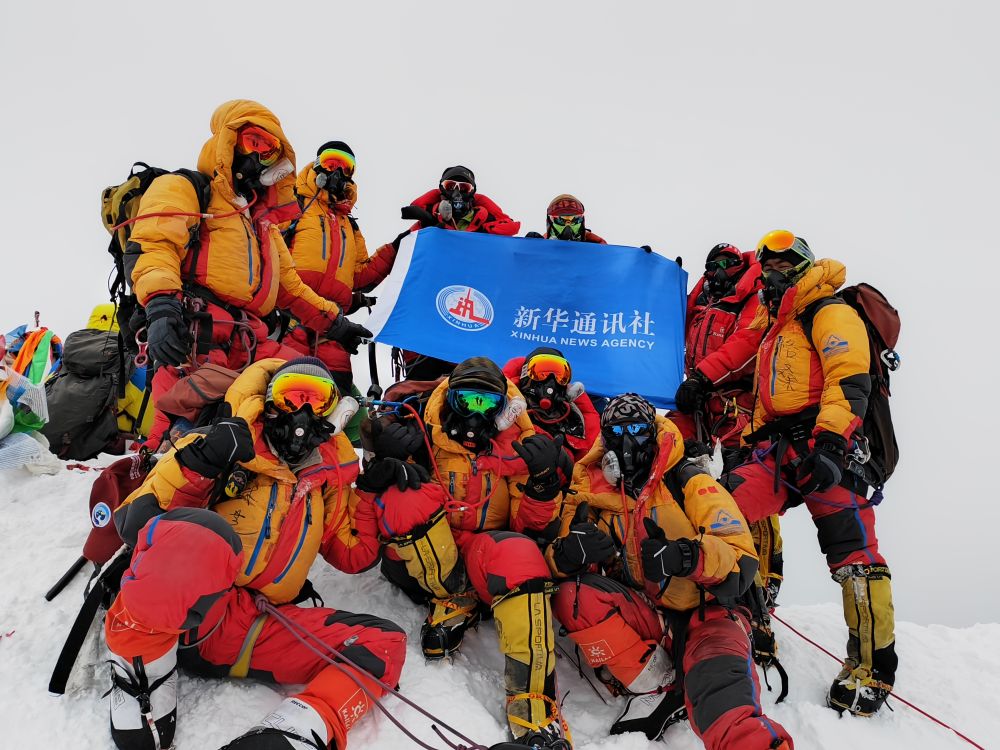 5月23日,科考登顶队员在珠峰峰顶展示新华通讯社社旗。(摄影:拉巴)