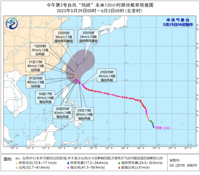 今年第2号台风“玛娃”(Mawar)已于昨天(28日)晚上减弱为强台风级,今天(29日)早晨5点钟其中心位于我国台湾省花莲县东南方大约780公里的西北太平洋洋面上,中心附近最大风力有14级(45米/秒)。