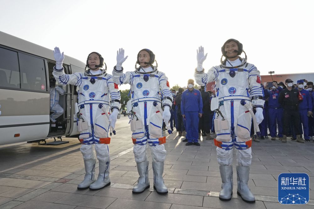 5月30日6时42分,神舟十六号载人飞行任务航天员乘组出征仪式在酒泉卫星发射中心问天阁圆梦园广场举行。这是航天员景海鹏(右)、朱杨柱(中)、桂海潮在出征仪式上。新华社记者 李刚 摄