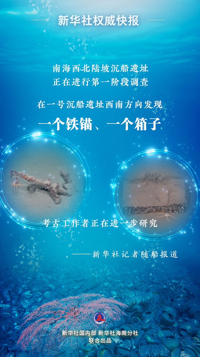 经国家文物局批准,由国家文物局考古研究中心、中国科学院深海科学与工程研究所、中国(海南)南海博物馆3家单位联合组成的深海考古队日前搭乘“探索一号”科考船,在南海西北陆坡一号、二号沉船遗址海域进行第一阶段调查,近日在一号沉船遗址西南方向发现一个铁锚和一个箱子,铁锚和箱子相距约50米。