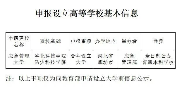 根据《中华人民共和国高等教育法》《普通高等学校设置暂行条例》《普通本科学校设置暂行规定》等有关规定,经组织专家考察、评议,拟向教育部申报设立应急管理大学,现予公示。公示时间为2023年5月29日至6月2日。
