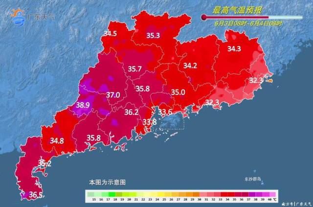 4日-6日,梅州、粤东的北部市县晴到多云有分散(雷)阵雨,其余市县雷阵雨局部暴雨或大暴雨。最高气温:粤西和珠三角南部沿海市县31℃~33℃,其余大部分市县34℃~36℃、部分市县37℃左右。