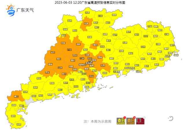 2日白天,我省继续出现大范围高温天气,最高气温具体分布为:沿海市县、清远北部31℃~34℃,其余市县普遍介于35℃~37℃,其中广州花都录得全省最高气温38.1℃。截至3日10时,全省各区县高温橙色或黄色预警信号继续生效中。