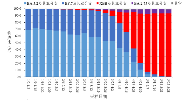 根据采样日期, XBB及其亚分支的占比逐渐增加,从5月1日-5月7日的84.6%,增长到5月22日-5月28日的92.4%。见图4。