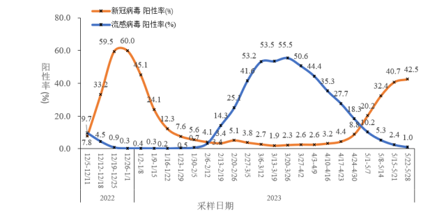 流感样病例新冠病毒阳性率从第17周的8.8%快速上升至第20周的40.7%,之后缓慢上升至21周的42.5%。见图3-2。