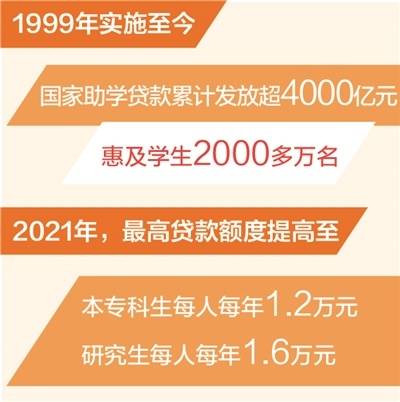 贷款额度不断提高。政策实施初期,全日制普通本专科生、研究生最高贷款额度每人每年6000元;2014年,提高至本专科生最高贷款额度每人每年8000元、研究生每人每年1.2万元;2021年,提高至本专科生最高贷款额度每人每年1.2万元、研究生每人每年1.6万元。