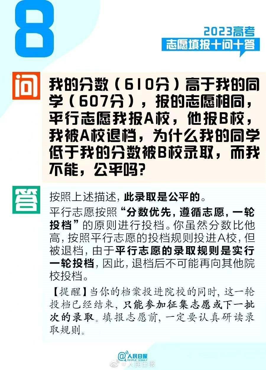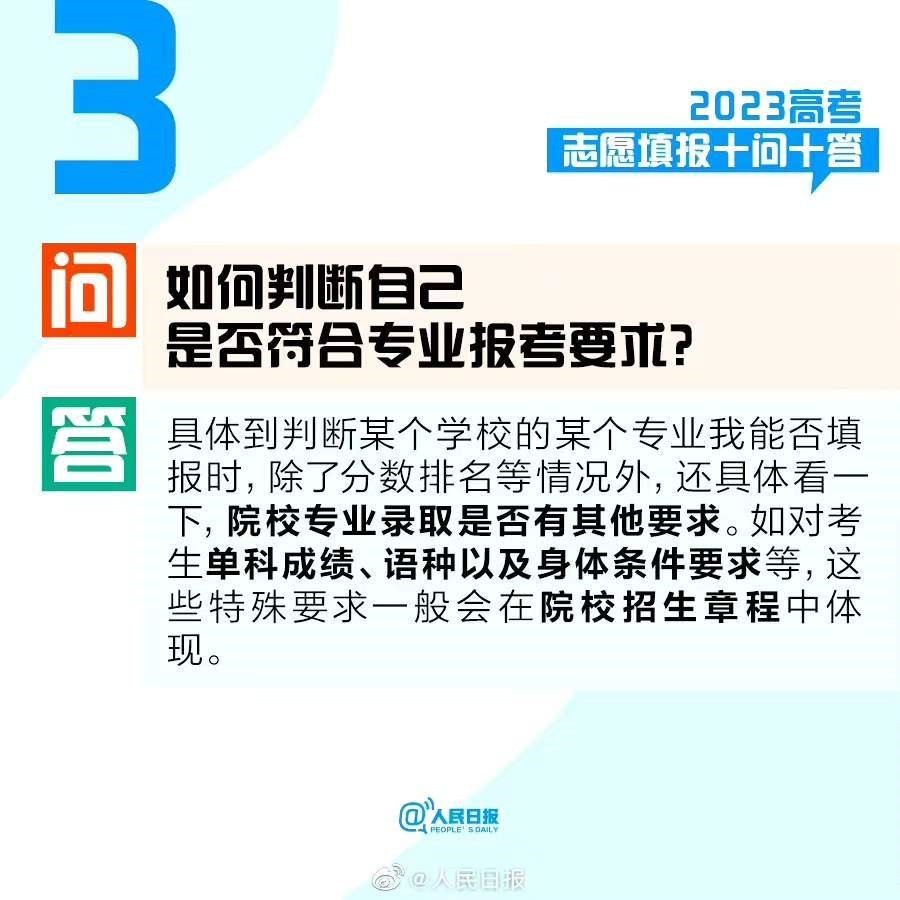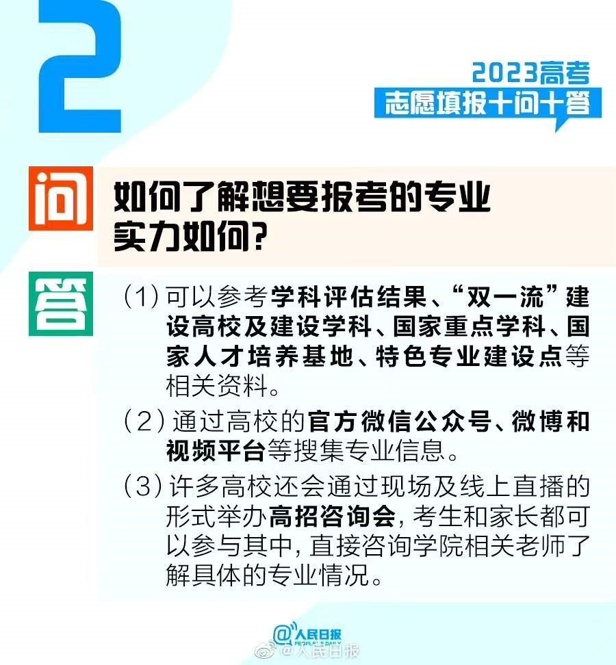 @考生和家长,2023高考志愿填报十问十答 2023-06-13 09:51 人民日报微博 0 高考结束,志愿填报即将开始,如何查询准确的高校与专业信息?高考填志愿如何避免高分低录? 10个关于高考志愿的高频问答↓↓ 祝福考生考入理想大学、学上喜欢的专业。 编辑:李舒宇 刘金鹏(实习) 审核:严海苑