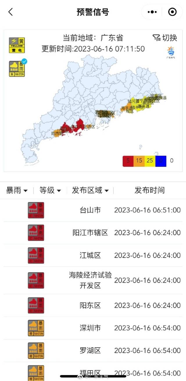 今天早晨,南部沿海上班雨如期而至,局部风大雨急,截至07时11分,阳江市辖区、台山等5个暴雨红色预警,深圳等15个暴雨橙色预警,陆丰等25个暴雨黄色预警生效中,上班上学路上请注意避开低洼积水路段,远离带电设备、大树、简易构筑物等。