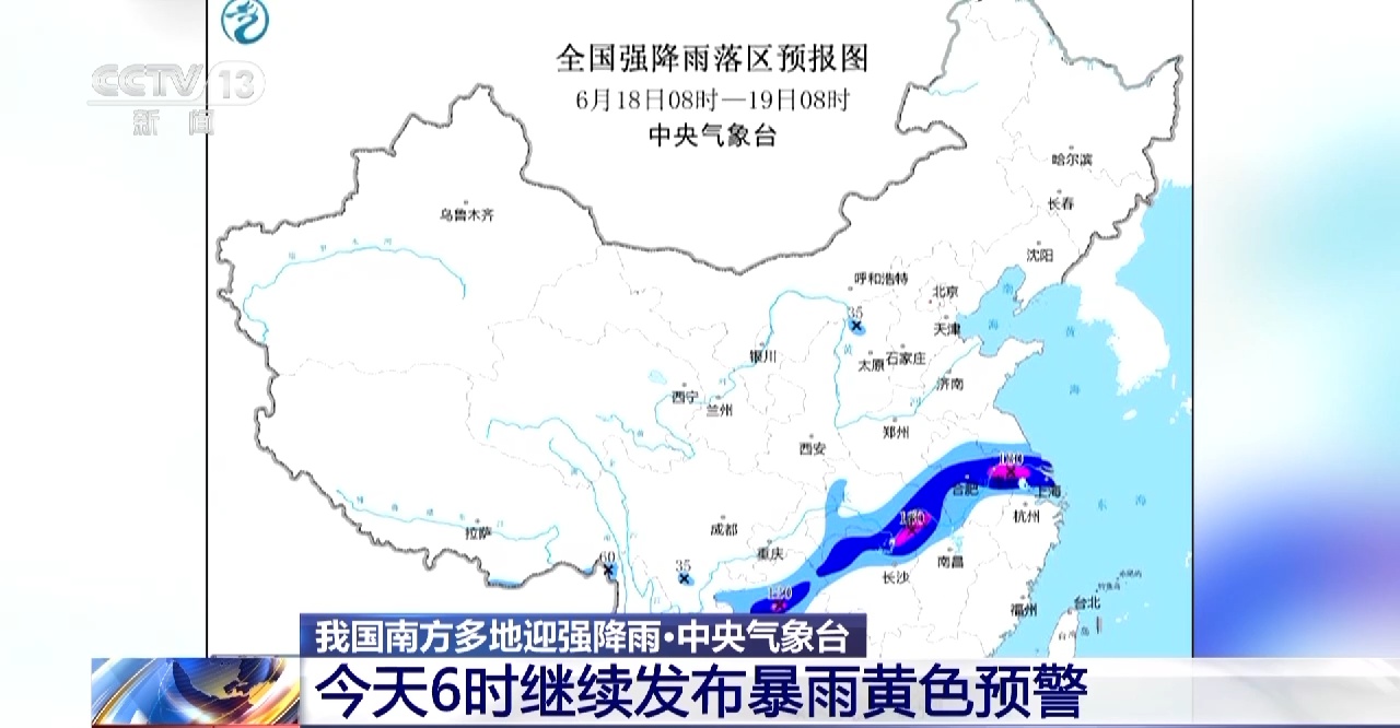 中央气象台今天早上6时继续发布暴雨黄色预警:预计,18日8时至19日8时,河南东南部、湖北大部、苏皖中部和南部、重庆东部、贵州中部和北部、湖南北部、江西北部、浙江北部、上海、广东中南部等地有大到暴雨。其中,安徽中部、江苏南部、湖北东部、湖南北部、贵州中部等地的部分地区有量级达到100~180毫米的大暴雨。