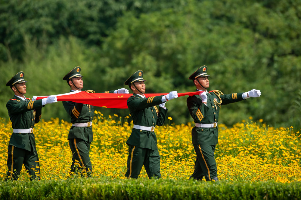 6月15日,护旗队护送国旗进入杭州亚运会火种采集仪式现场。新华社记者 江汉 摄
