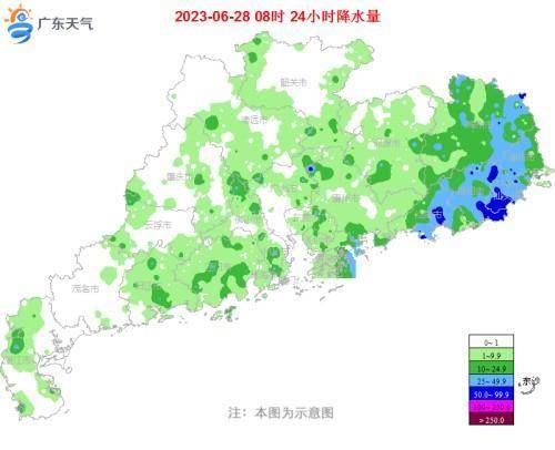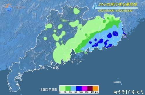预计,29日,受东风波动影响,粤东市县有大雨局部暴雨或大暴雨,28日到7月1日广东中北部市县有35℃左右局部37℃的高温。注意防晒防暑降温。需防范局部强降水及其引发的城乡内涝、山体滑坡等地质灾害。