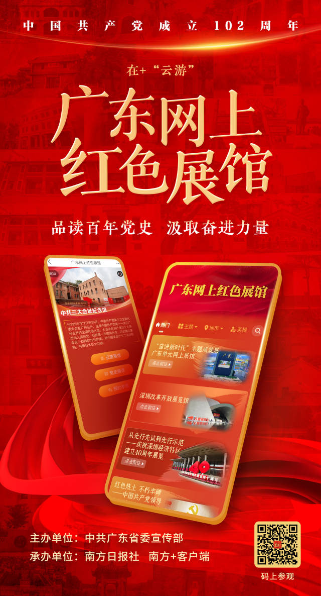 7月1日是中国共产党诞生纪念日,一起来一场红色之旅吧!打开由中共广东省委宣传部主办,南方日报、南方+建设打造的“广东网上红色展馆”,动动手指,足不出户即可“云游”广东红色景点,品读百年党史。