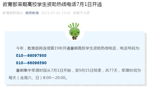 这是教育部连续第19年开通暑期高校学生资助热线电话。今年,为进一步向学生与家长提供更加高效、便捷的服务与帮助,教育部全面扩大热线电话开通范围,要求各中央部属高校,全国各省(区、市)及所属高校、市(地、州、盟)、县(市、区、旗)全部开通暑期高校学生资助热线电话。