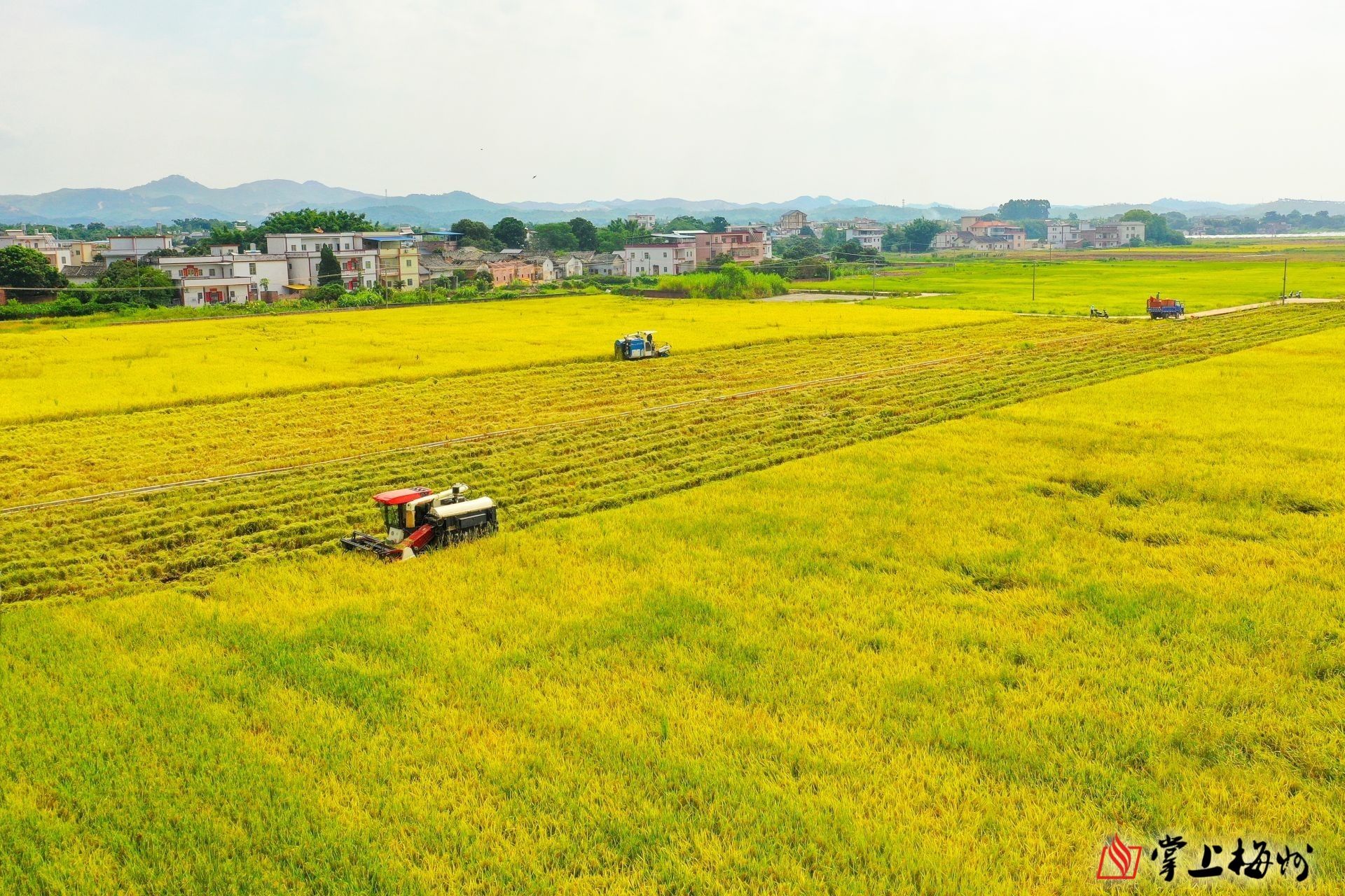 农机在稻田里来回作业进行收割。(高讯 摄)
