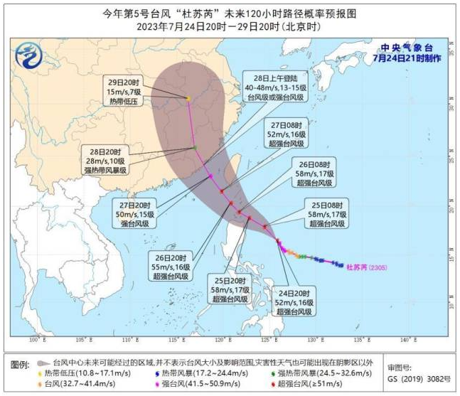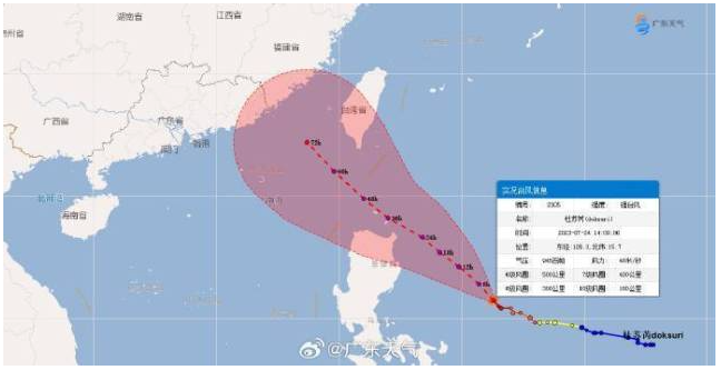 今年第5号台风“杜苏芮”,在7月24日夜间增强至超强台风级。从7月24日傍晚起,广东部分沿海市县区已对“杜苏芮”发布台风预警信号。广东省气象台预计,即使“杜苏芮”最终不登陆广东,按现有气象资料预计,“杜苏芮”也将对南海东北部海面和粤东海面及沿海地区带来严重影响,建议各地先做好相关防御工作。