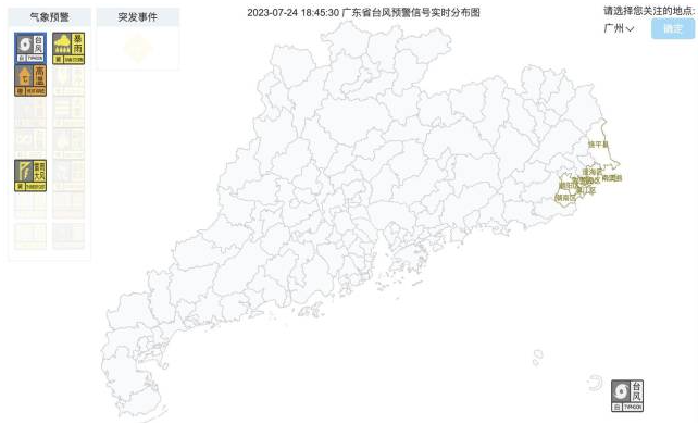 截至24日18时45分广东台风预警信号发布情况,广东气象网截图