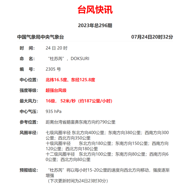 中央气象台在24日20时32分的台风快讯中,宣布“杜苏芮”增强至超强台风级