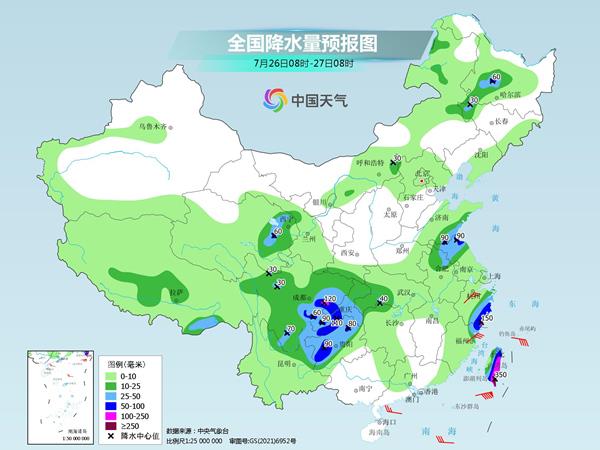 中央气象台预计,今天,青海东部、江苏北部、浙江南部、西南地区东部、台湾岛大部等地部分地区有大到暴雨,其中,浙江南部、四川盆地中部、重庆西部、台湾岛东部和南部等地部分地区有大暴雨,台湾岛东部和南部等地局地特大暴雨(250毫米~350毫米)。