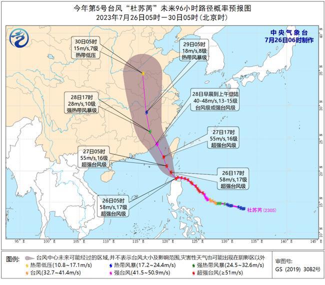 今年第5号台风“杜苏芮”(DOKSURI)(超强台风级)的中心今天(26日)早晨5点钟位于我国台湾省鹅銮鼻偏南方大约350公里的巴士海峡海面上,就是北纬18.8度、东经121.3度,中心附近最大风力有17级(58米/秒),中心最低气压925百帕,七级风圈半径300-450公里,十级风圈半径120-180公里,十二级风圈半径90-120公里。