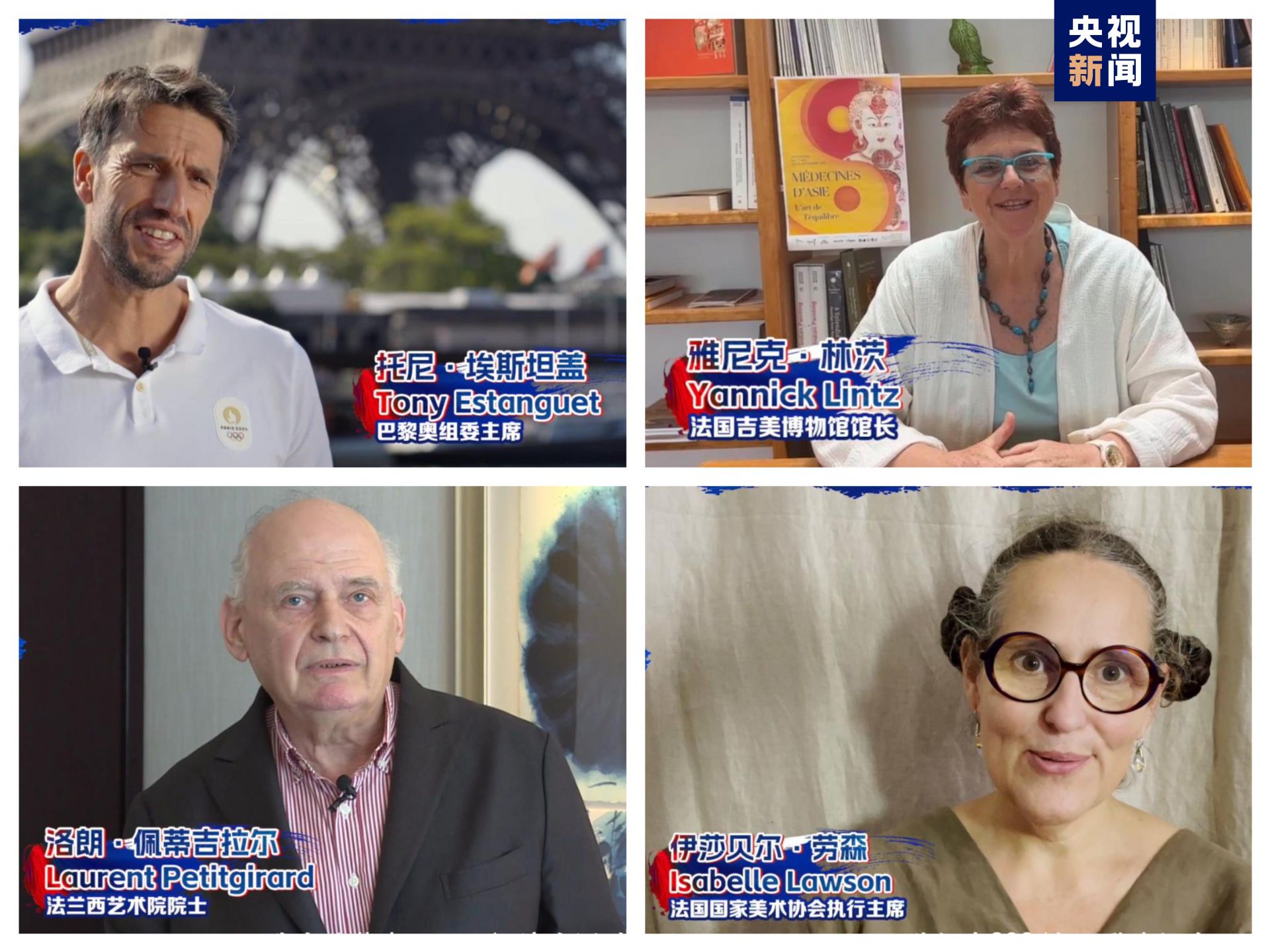 巴黎奥组委主席托尼·埃斯坦盖视频访谈中,向中国体育健儿、观众和艺术家们发出美好祝愿与邀请。法国吉美博物馆馆长雅尼克·林茨、法兰西艺术院院士洛朗·佩蒂吉拉尔、法国国家美术协会执行主席伊莎贝尔·劳森等法国艺术界代表向中国艺术家发出诚挚邀请。