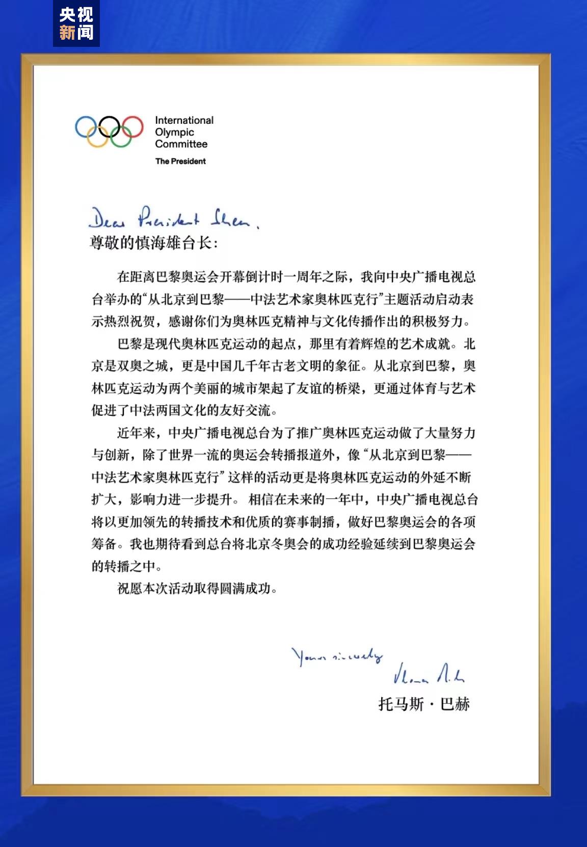 国际奥委会主席巴赫在贺信中表示,中央广播电视总台为了推广奥林匹克运动做了大量努力与创新,除了世界一流的奥运会转播报道外,像“从北京到巴黎——中法艺术家奥林匹克行”这样的活动更是将奥林匹克运动的外延不断扩大,影响力进一步提升。相信在未来的一年中,中央广播电视总台将以更加领先的转播技术和优质的赛事制播,做好巴黎奥运会的各项筹备,期待看到总台将北京冬奥会的成功经验延续到巴黎奥运会的转播之中。