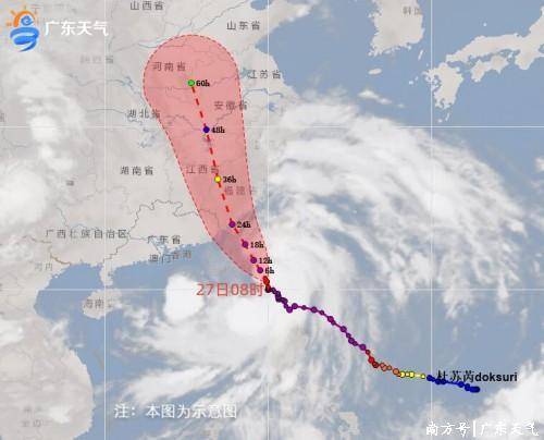 预计:27日-28日,粤东海面、南海东北部、台湾海峡海面有10级~14级的大风,台风中心经过的附近海面旋转风15级~16级,阵风17级或以上;27日白天,广东有大范围35℃~38℃的高温和分散雷阵雨局部暴雨,雷雨时伴有8级~10级短时大风;27日夜间-29日早晨,受“杜苏芮”影响,广东东部市县有明显风雨。梅州、汕头、潮州有暴雨局部大暴雨,风力逐渐加大到8级~10级,阵风12级,惠州、汕尾、河源、揭阳有大雨到暴雨和6级~8级阵风。需继续做好台风的相关防御工作。