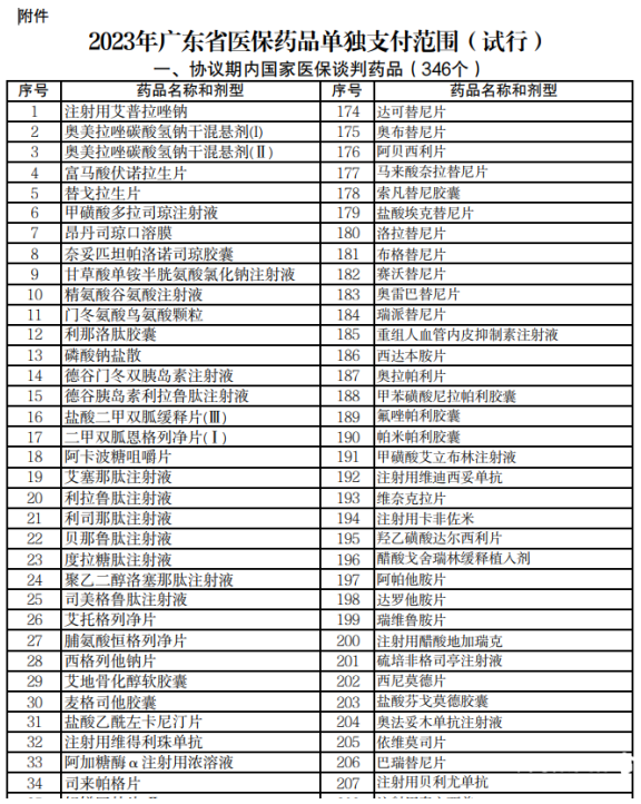 据《通知》,此次试行的范围为2023年广东省医保药品单独支付范围共计403个药品,其中协议期内国家医保谈判药品为346个,竞价药品为17个,转为医保药品目录内常规药品的原国谈药40个。通知自2023年9月1日起实施,试行期限2年。