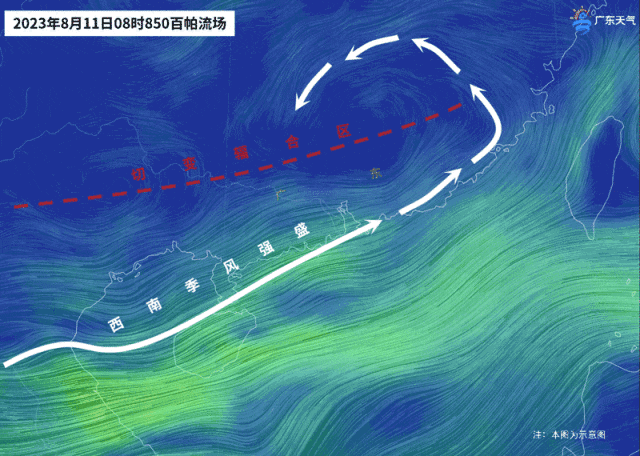 虽然双台风对广东影响不大,但是“解暑雨”已经在路上了 。从8月11日的流场图可见,双台风北上的同时,位于南海的西南季风也有所北抬,季风云团将会爬上华南沿岸。