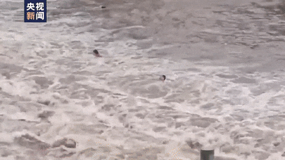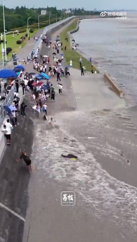 近日,浙江杭州,钱塘江涨潮,不少游客在岸边近距离观潮时,被潮水卷入摔倒。