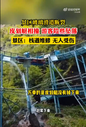 7月23日,云南,曲靖会泽大地缝景区玻璃滑道突然断裂,皮划艇相撞,游客险些坠落。