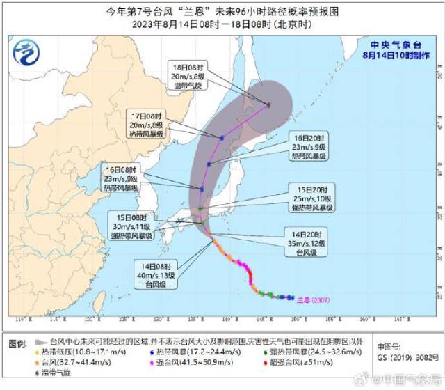 今年第7号台风兰恩(LAN)(台风级)的中心14日上午8时位于日本和歌山县新宫市东南方向约270公里的日本以南洋面上,中心附近最大风力有13级(40米/秒)。预计,“兰恩”将逐渐向日本本州岛南部沿海靠近,并将于今日早晨到上午在上述沿海登陆(30-35m/s,11-12级,强热带风暴级或台风级),15日夜间开始在日本海东南部转向北偏东方向移动,强度逐渐减弱。