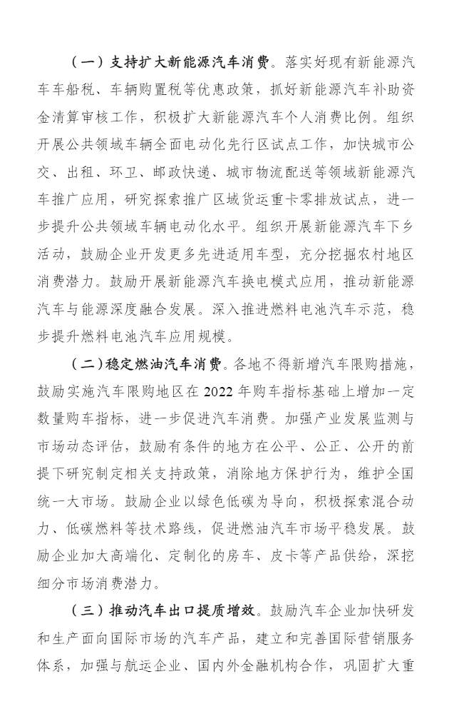 工信部等七部门近日印发汽车行业稳增长工作方案(2023—2024年)。其中提到,稳定燃油汽车消费,各地不得新增汽车限购措施,鼓励实施汽车限购地区在2022年购车指标基础上增加一定数量购车指标,进一步促进汽车消费。加强产业发展监测与市场动态评估,鼓励有条件的地方在公平、公正、公开的前提下研究制定相关支持政策,消除地方保护行为,维护全国统一大市场。鼓励企业以绿色低碳为导向,积极探索混合动力、低碳燃料等技术路线,促进燃油汽车市场平稳发展。鼓励企业加大高端化、定制化的房车、皮卡等产品供给,深挖细分市场消费潜力。