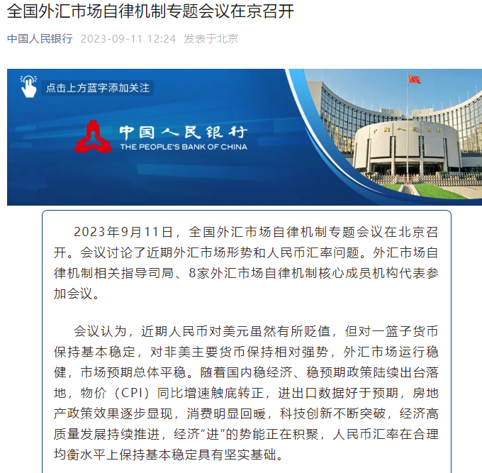 2023年9月11日,全国外汇市场自律机制专题会议在北京召开。会议讨论了近期外汇市场形势和人民币汇率问题。外汇市场自律机制相关指导司局、8家外汇市场自律机制核心成员机构代表参加会议。