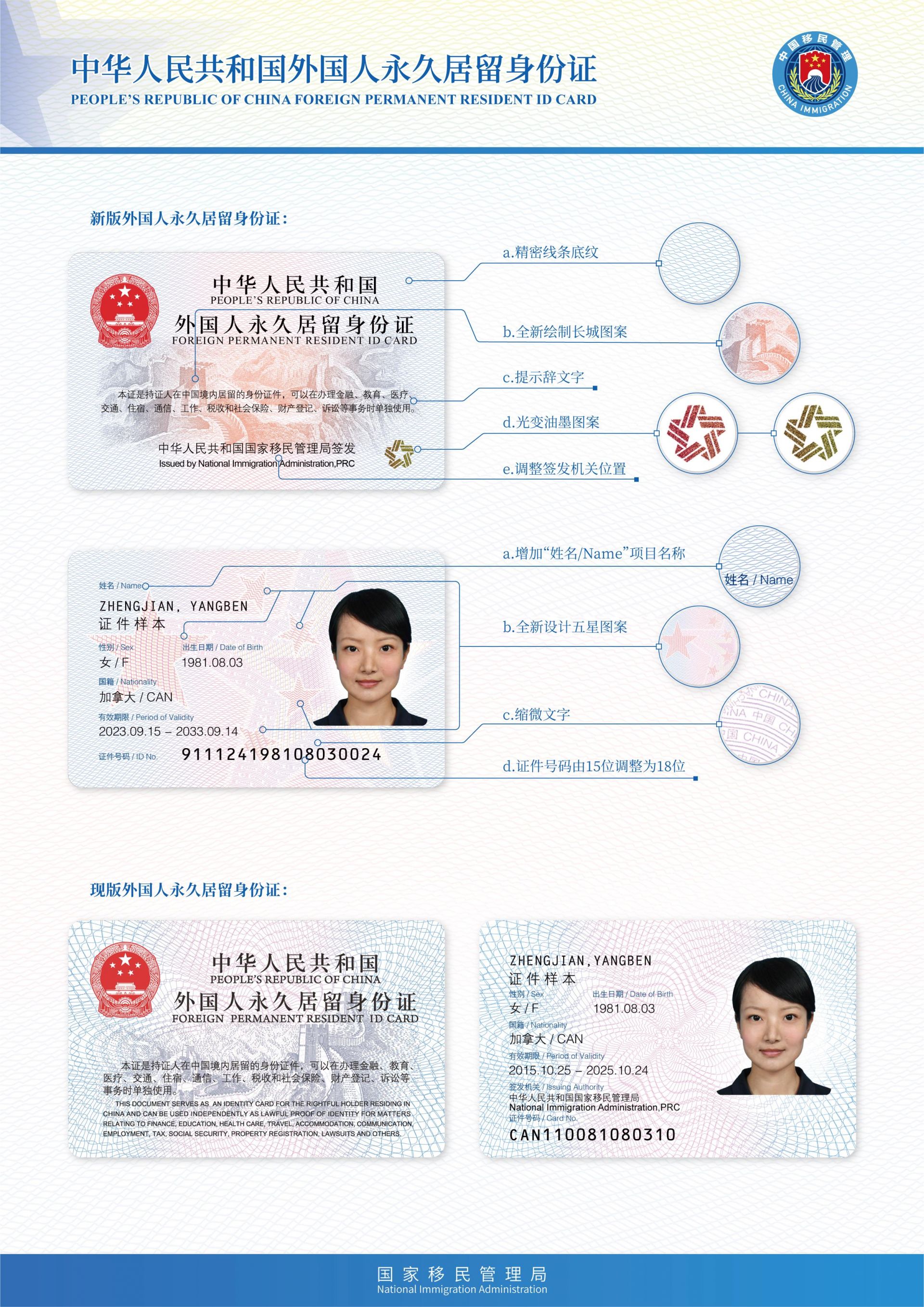 新版永居证在保持现版基本式样的基础上,新加入了体现国家标识的五星元素,优化美化版式布局,采用更为先进的防伪技术,改进提升了证件信息存储和应用管理服务手段。新版永居证升级技术、增强功能,新证启用后,持证人可通过互联网平台线上办理交通出行、生活消费、金融等私人事务,将进一步便利持证人在境内工作、学习、生活。