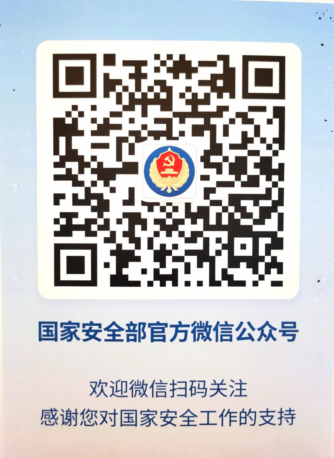 扫描识别下方二维码,关注国家安全部官方微信公众号。学习国家安全知识,共同守护国家安全!
