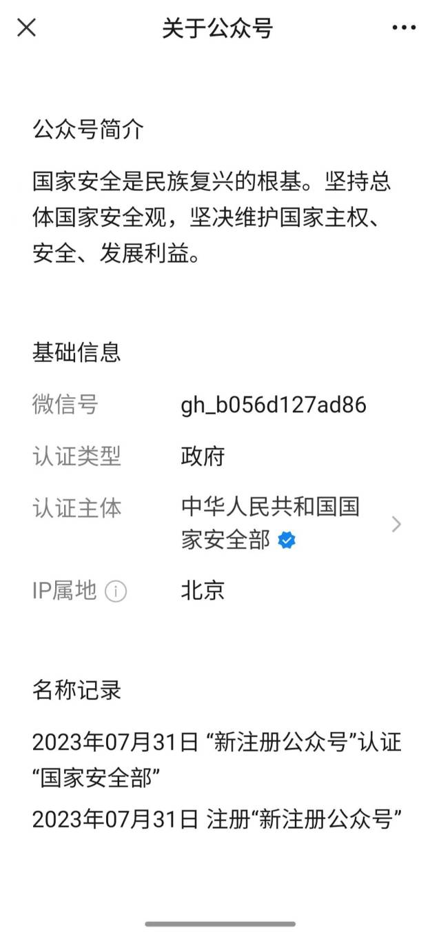 注册信息显示,该微信公众号注册于2023年7月31日,并于当天认证“国家安全部”。其认证类型为“政府”,认证主体为“中华人民共和国国家安全部”,IP属地位于北京。