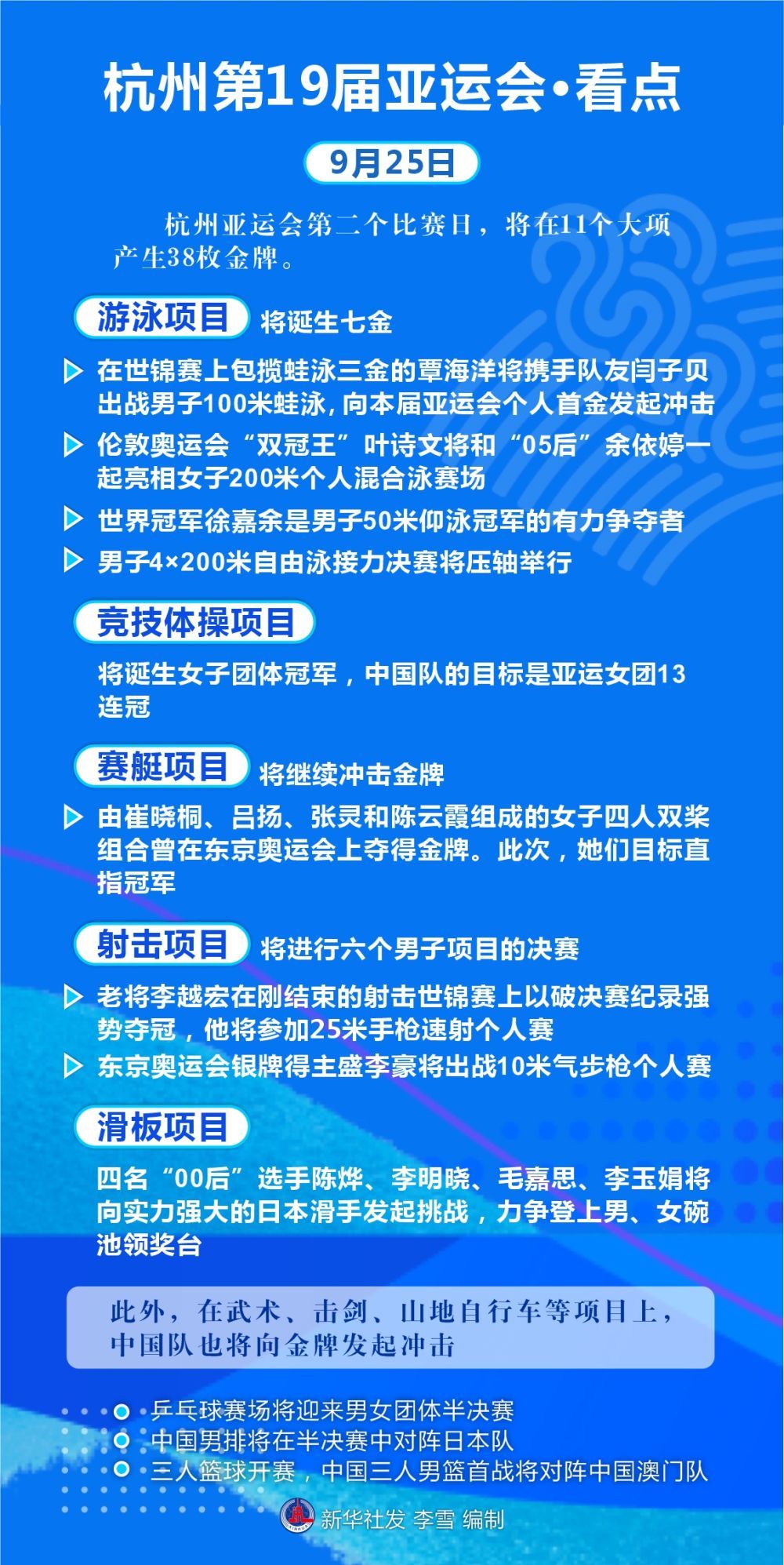 图表|杭州第19届亚运会·看点(9月25日) 2023-09-25 09:17 新华社 1 9月25日是杭州亚运会开幕后第二个比赛日,将在11个大项产生38枚金牌。新“蛙王”覃海洋和连续12届亚运会体操女团冠军中国队都将全力以赴,捍卫冠军荣耀。 图表:李雪 编辑:刘家豫(实习)张晓珊 审核:张英昊